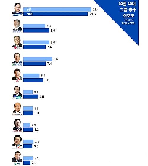 이미지 확대보기여론조사기관 리얼미터는 26일 월간 10대 그룹 총수 선호도를 조사한 결과 이 부회장이 9월 조사 결과 대비 1.1%p 하락한 21.3%의 선호도로 1위를 유지했다고 밝혔다.