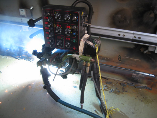 대용착 수평자세 자동용접기는 1회 용접으로 전체 용접면적의 90% 이상을 용접할 수 있으며, 길이 20~50m 연속 작업 중 이음부 틈새가 4~14mm 변동해도 자동으로 용접 조건을 적응·제어하며 작업을 완료한다.