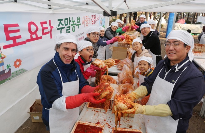 [글로벌이코노믹 박관훈 기자] 한국토요타자동차는 지난 21일 경기도 고양 산울안민속농원에서 토요타 고객들로 구성된 약 80명의 ‘2015 토요타 주말농부’들과 함께 주말농사의 결실을 맺는 사랑의 김장 나누기 행사를 열었다고 22일 밝혔다.토요타 주말농부 프로그램은 토요타 구매고객들에게 텃밭을 제공하고, 주말마다 손수 다양한 작물을 재배, 친환경과 함께하는 생활을 직접 체험하도록 하는 프로그램으로 2012년부터 시작됐다.