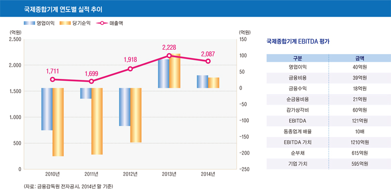 글로벌이코노믹이 2014년 말 국제종합기계의 재무제표를 분석한 결과, 이 회사의 법인세·이자·감가상각비 차감 전 영업이익(EBITDA)은 121억원 상당으로 나타났다.