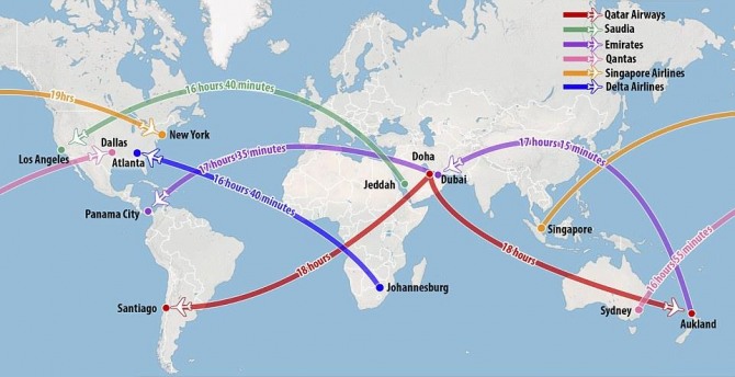 그리고 세계에서 제일 긴 직행 노선은 호주항공의 시드니와 달라스 간 노선이다. 비행시간은 무려 17시간(16시간 55분)에 육박한다. 그러나 2018년에는 싱가포르 항공사가 싱가포르에서 뉴욕(뉴왁 리버리티공항)까지 무려 1만5350km 거리와 비행시간은 19시간이 소요되는 이 노선을 운행할 예정이다. 거의 20시간을 비행기안에서 보내야 한다. 싱가포르 항공은 이 노선을 2012년에 운항하다가 수익이 나지 않자 중단한 적이 있다.