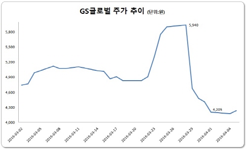 유상증자 발표 전주인 3월 23일, 24일 양일간 GS글로벌의 주가는 7.94%, 8.49% 각각 증가했다. 이후 유증 발표 전일인 3월 28일까지 GS글로벌의 주가는 계속 상승해 5940원을 기록, 연중 신고가를 경신하기도 했다. 하지만 당시 주가가 갑자기 오를만한 재료가 없었다는 것이 업계 관계자의 설명이다.
