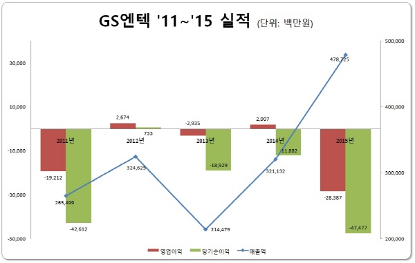 이미지 확대보기GS엔텍은 2012년 27억원, 2014년 20억원 가량의 영업이익을 기록했을 뿐 사업을 통해 벌어들인 돈이 미미한 수준이다. 반면, 2011년 192억원, 2013년 29억원의 영업손실을 기록했으며, 지난해에는 284억원 가량의 대규모 영업손실이 발생했다.