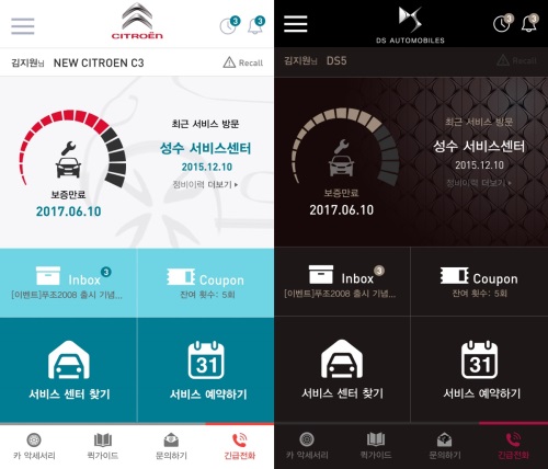 이미지 확대보기시트로엥과 DS 브랜드 서비스 어플리케이션은 시트로엥과 DS 고객들이 쉽고 편하게 차량을 관리하고 서비스 받을 수 있도록 도와주는 차량 관리 어플리케이션이다. 해당 어플리케이션은 다양한 주요 정보들을 메인 화면에서 바로 확인할 수 있도록 구성됐다.
