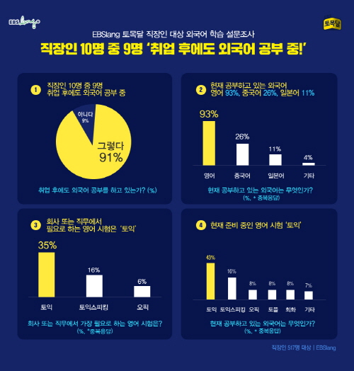 온라인 교육 사이트 EBSlang(EBS랑)은 9월 1일부터 11일까지 EBSlang의 직장인 회원 517명을 대상으로 외국어 학습실태에 대한 설문조사를 한 결과, 취업 후 외국어 학습 여부에 대해 응답자 91%는 ‘직장생활 중에도 외국어를 공부한다’고 답변했다고 밝혔다.