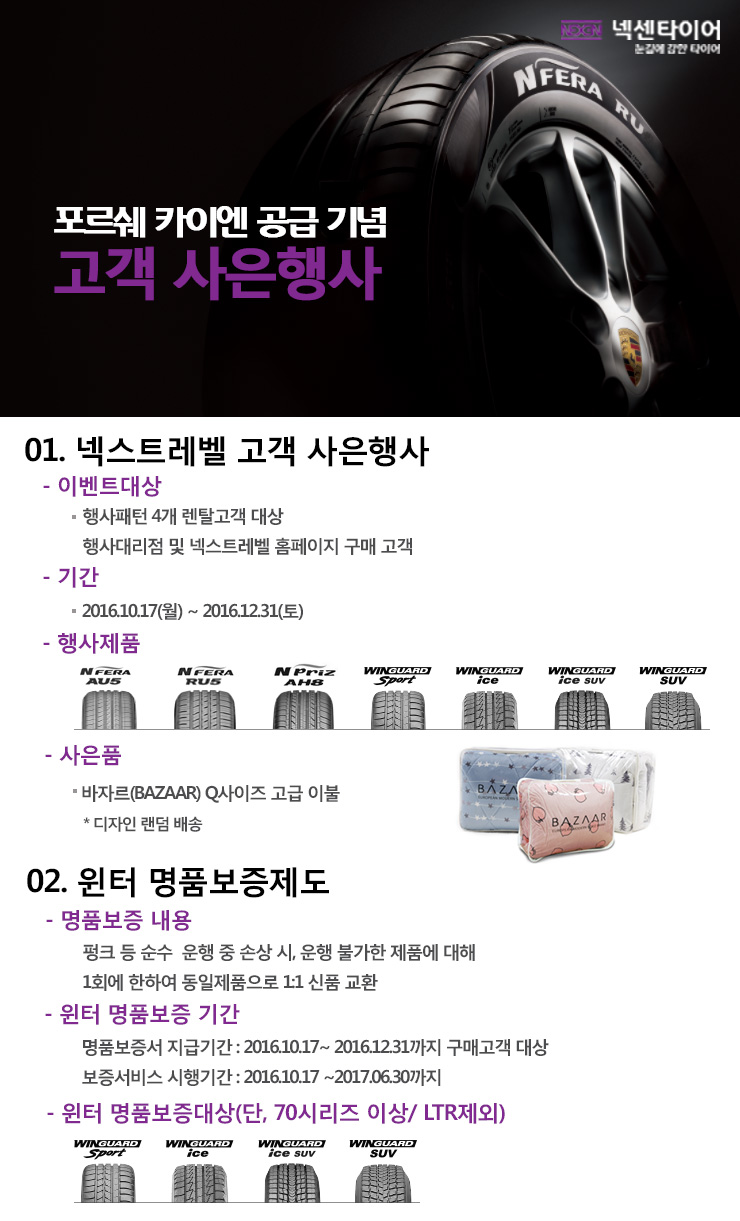 이 달 17일부터 12월 31일까지 진행되는 사은 이벤트는 윈터제품인 윈가드 스포츠, 윈가드 ice, 윈가드 ice SUV, 윈가드 SUV와 프리미엄 제품인 엔페라 AU5, 엔페라 RU5, 엔프리즈 AH8 중 4개를 렌탈하면 고객이 입력한 주소지로 ‘바자르(BAZAAR) 퀸사이즈 고급 이불’이 배송된다. 행사 참여점은 넥스트레벨 홈페이지에서 확인 할 수 있다.