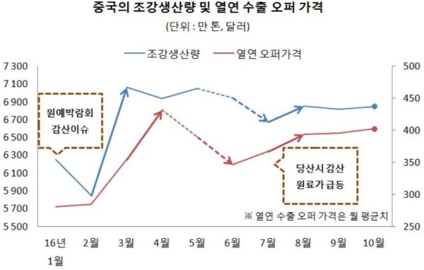 하반기 중국강철공업협회까지 나서 철강사들의 감산을 권고했지만 8월 조강량은 6857만톤, 9월과 10월에는 6817만 톤, 6851만 톤으로 1~10월 평균치인 6732만 톤을 모두 웃돌았다. 높은 가격에 많은 양을 생산 판매하겠다는 원칙이 꾸준히 반영된 셈이다.