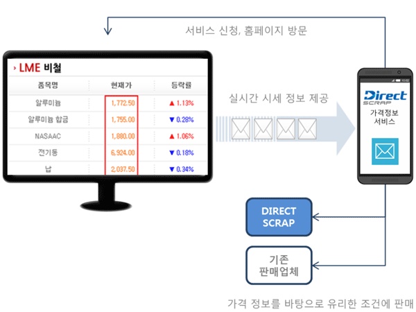 이에 다이렉트스크랩은 인터넷 홈페이지 게시정보, Q&A, 블로그, SNS, 시세문자서비스 등을 통하여 고객에게 스크랩 유통 정보 및 판매 가격 정보뿐만 아니라 관련 법규 및 세금 관련 정보까지 제공하여 고객의 이윤을 최대화 할 수 있는 토탈 솔루션 시스템을 제공하고 있습니다.