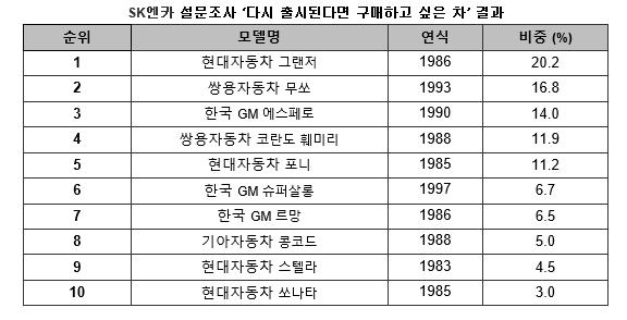출시된 지 20년 이상 된 국산 모델을 대상으로 지난 1월 한 달 동안 진행한 이번 선물조사는 성인남녀 총 4950명이 참여한 가운데 1986년식 현대차 그랜저가 20.2%로 1위에 선정됐다.