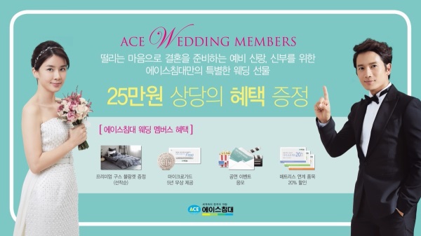 예비 부부들의 경우 ‘에이스 웨딩 멤버스’에 가입한 후 구매하면 프리미엄 구스 블랑켓, 마이크로 가드 5년 무상 제공, 매트리스 연계 품목 할인 쿠폰 등 약 25만원 상당의 추가 혜택을 제공받는다. 가입신청은 에이스침대 홈페이지에서 가능하며 가입만 해도 뮤지컬·연극· 콘서트·영화 등 공연 티켓과 매트리스 연계품목 20%할인 LMS쿠폰 등을 받을 수 있다.