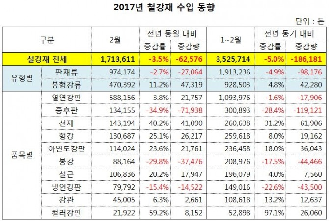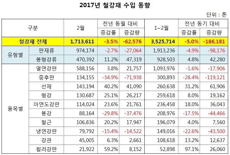 올 1~2월 철강재 수입 353만 톤 기록 5% 감소…판재류 품목별 온도차