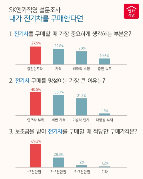 최현석 SK엔카직영 직영사업부문장은 "최근 미국 대표 전기차 브랜드 테슬라가 한국에 상륙하면서 전기차에 대한 소비자들의 관심이 집중되고 있는 상황"이라며 "이번 설문조사에서 전국의 전기차 충전 인프라 구축이 소비자의 최대 관심사로 꼽힌 만큼 적극적인 개선을 통해 가까운 미래에는 도심에서 쉽게 전기차를 볼 수 있기를 기대한다"고 말했다.
