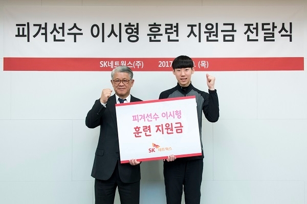 이미지 확대보기SK네트윅스는 30일 서울 명동 사옥 대회의실에서 공식 후원금 전달식을 진행했다. 후원금은 경기 사회복지공동모금회를 통해 이 선수에게 전달된다.