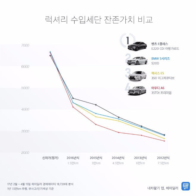 대표적인 럭셔리 수입세단으로 손꼽히는 벤츠 E클래스, BMW 520d, 렉서스 ES350, 아우디 A6는 출고 2년 후 중고차 가격차이가 가장 컸다. 2015년식 벤츠 E클래스는 4200만원인데 반해 BMW 520d는 3800만원, 렉서스 ES350 3650만원 순이였다. 아우디 A6 3300만원 이였다. 신차가격이 비슷한 벤츠 E클래스가 렉서스 ES350 대비 약 450만원 높은 중고값을 받을 수 있는 셈이다.