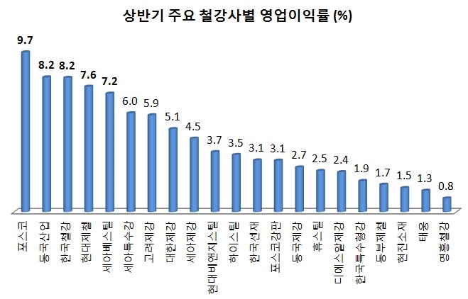포스코·현대제철 이익률은 9.0%, 나머지 기업들은 3.6%에 그쳤다. 이에 따라 이들의 격차는 지난해 상반기 3.7%포인트였던 것이 올해 5.4%p로 확대됐다. 전년 동기 대비 등락을 비교해봐도 포스코 및 현대제철은 1.3%p 하락한 데 비해 나머지 기업들은 3.0%p나 떨어졌다.