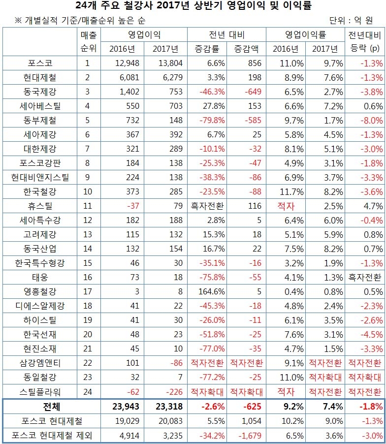 포스코 현대제철 5% 내외 증가…24개사 중 절반이상 영업익 추락