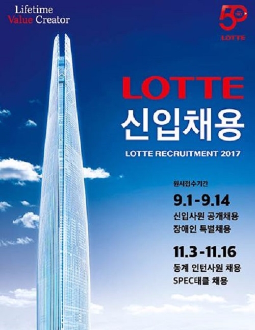 롯데그룹이 2017년 하반기 신입 공개채용 및 장애인 특별채용을 진행 중이다. 신입 공개채용 중인 회사는 식품부문(8개사), 관광부문(4개사), 서비스 부문(11개사), 유통 부문(8개사), 유화부문(4개사), 건설/제조부문(5개사), 금융부문(4개사)으로 총 44개사이며 접수방법은 롯데 채용 홈페이지 접속 후 인터넷을 통한 온라인 접수를 통해 가능하다.