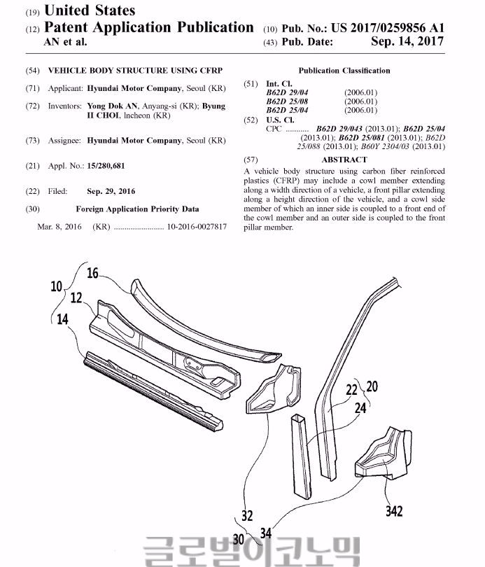 이미지 확대보기10일 업계에 따르면 현대차는 미국 특허청(USPTO)으로 부터 CFRP로 제작된 프론트 섀시 구조에 대한 특허를 지난달 14일 취득했다.