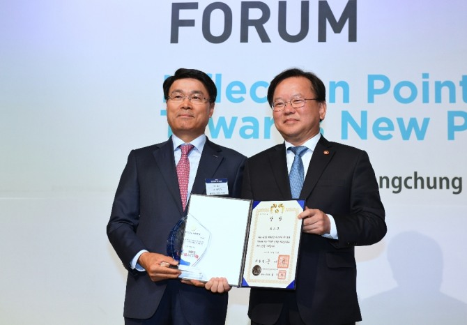 서울 신라호텔에서 개최된 '대한민국 지식대상' 시상식에는 김부겸 행정안전부 장관이 최정우 사장에게 대표시상했다.