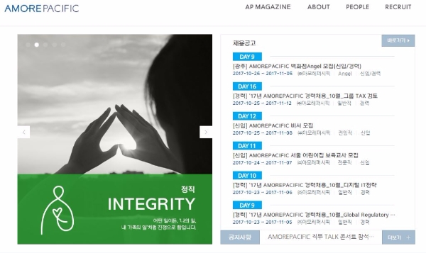 27일 아모레퍼시픽 채용 홈페이지에는 17개의 채용 공고를 내고 지원서 접수를 받고 있다. 서류접수를 앞두고 있는 채용은 경력직 사내 변호사로 10월 29일 자정까지다.