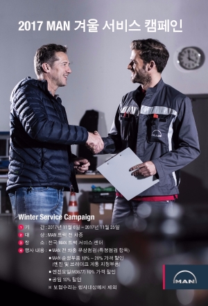 세계적인 상용차 생산업체인 만그룹의 한국지사인 만트럭버스코리아는 겨울철 고객의 안전한 운행을 위해 25일까지 전국 만트럭버스코리아 서비스센터에서 ‘2017 MAN 겨울 서비스 캠페인’을 진행한다고 밝혔다.