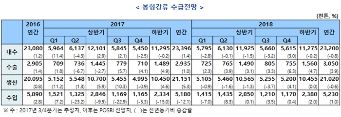 7일 포스코경영연구원(이하 포스리)에 따르면 2018년 봉형강 내수는 2300만 톤으로 2017년 대비 0.8% 감소할 것으로 전망했다. 철근 수요가 소폭 감소할 예정이며, 형강·선재는 전년수준에 유지할 것으로 전망됐다.