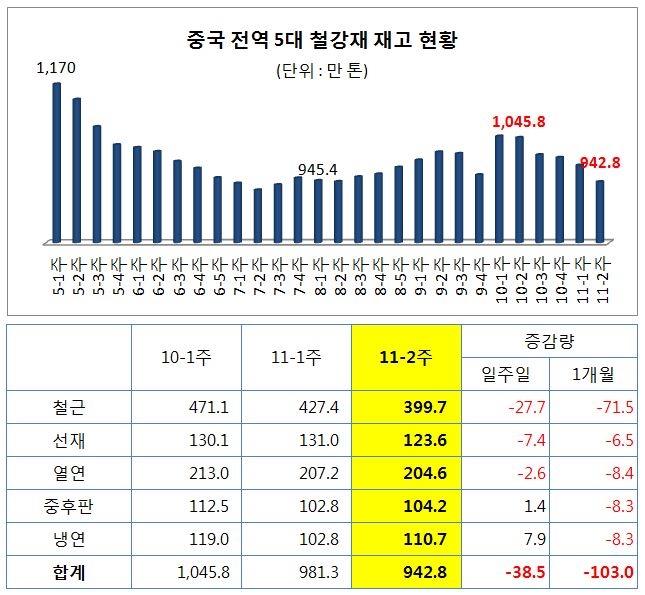 실제 중국 전역의 5대 철강재(철근 선재 열연 냉연 중후판) 재고는 10일 기준 942만8000톤으로 전주보다 38만5000톤 감소했다. 이는 8주 연속 감소한 것으로 7월 중순 이후 17주 최저치로 기록됐다.
