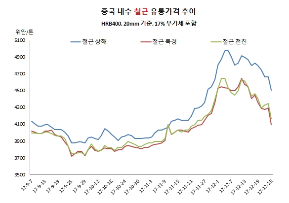 26일 업계에 따르면 중국 철근 거래가격은 주요 3개 지역에서 톤당 160~200위안 수준의 급락을 기록했다. 특히 한국 수출 주력지역인 천진지역 철근 거래가격은 톤당 4170위안(약 636달러, 17% 부가세포함)까지 하락했다.