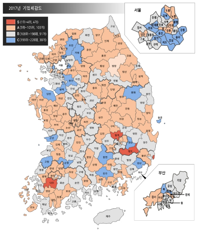 ‘전국기업환경지도’는 지방자치단체별 기업 경영여건을 5개 등급(S-A-B-C-D)으로 나눠 평가한다. 평가항목은 지자체 행정에 대한 만족도를 조사한 ‘기업체감도’와 지자체의 규제여건과 지원제도를 객관적인 수치로 분석한 ‘경제활동친화성’ 2개 부문으로 구성된다.