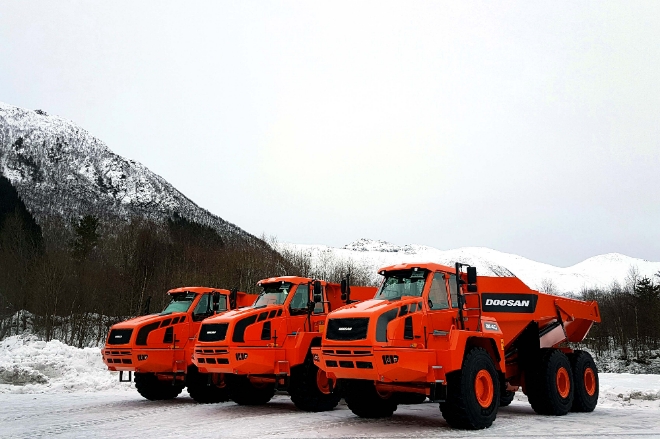 두산인프라코어 관계자는 “굴절식 덤프트럭은 주로 광산과 채석장 등 험준한 환경에서 쓰는 특수 장비로 단일 계약으로 20대를 수주한 것은 역대 최대 성과”라며 “노르웨이 3개년 평균 연간 판매량을 연초에 모두 소화한 것”이라고 밝혔다.