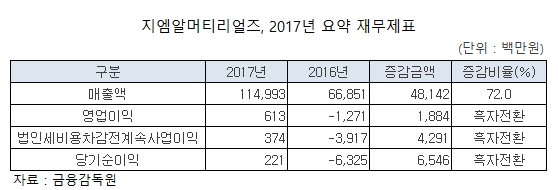 이미지 확대보기이 회사는 지난 30일 공시를 통해 2017년 6억 1,300만원의 영업이익을 달성해 흑자전환 했다고 밝혔다. 이 기간 매출액은 1,150억원으로 전년대비 72% 급증했다. 당기순이익도 2억 2,100만원을 기록했다.