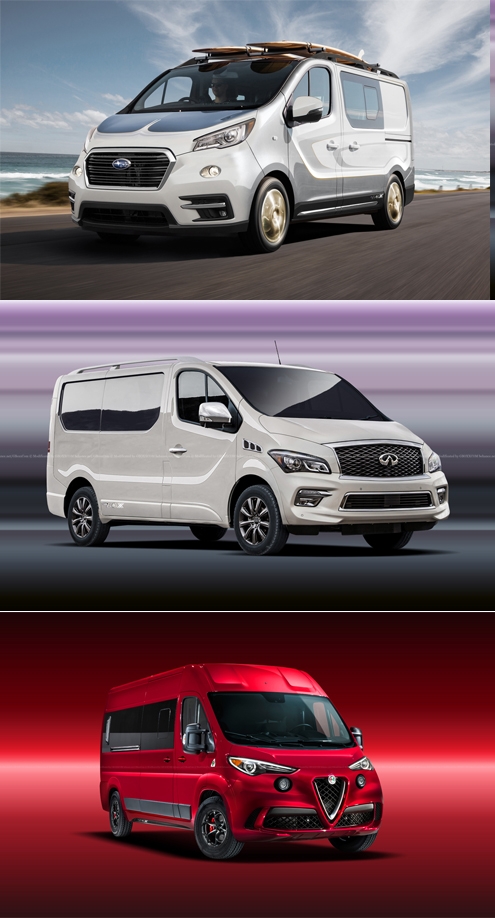 이외에도 디지털 아티스트 니키타는 스바루 SUV 어센트, 알파로메오 SUV 스텔비오, 인피니티 SUV XQ80을 이용해 밴으로 재해석했다. 특히 각 브랜드에서 대형 SUV라고 손꼽히는 모델을 사용했다.