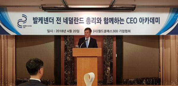 발케넨더 네덜란드 전총리(43대, 2002~2010)는 20일 서울 롯데호텔에서 개최된 월드클래스300기업협회(회장 윤동한) CEO 아카데미초청강연에서 이같이 밝혔다.