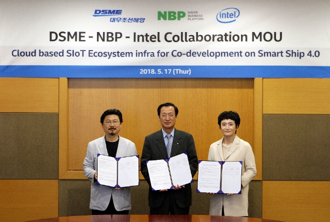 이미지 확대보기대우조선해양은 네이버 비즈니스 플랫폼, 인텔코리아와 함께 스마트십 4.0 서비스 인프라 구축을 위한 공동 프로젝트를 추진하기로 합의하고 이를 위한 업무협약(MOU)를 체결했다고 21일 밝혔다.
