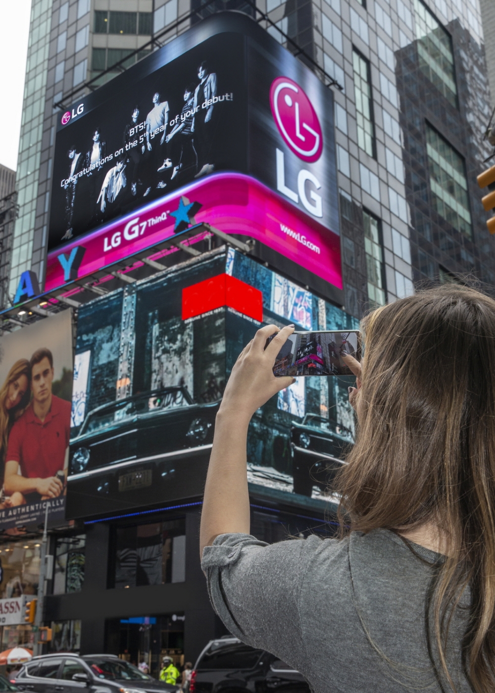 이미지 확대보기하루 유동인구가 150만 명에 달하는 뉴욕 타임스스퀘어에서 관광객들을 통해 방탄소년단과 LG G7 ThinQ가 다시 한번 화제가 될 전망이다. 방탄소년단은 지난 4월부터 LG G7 ThinQ 광고 모델로 활동하고 있다.