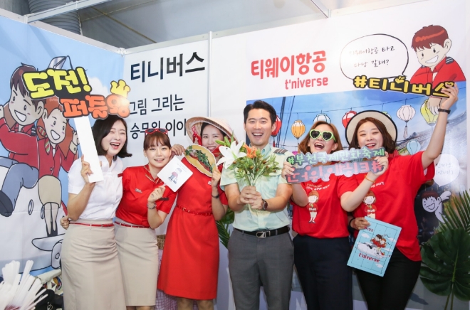 티웨이항공의 승무원들이 만화 축제에 참가해 시민들과 함께 했다. 티웨이항공의 객실승무원으로 구성된 '티니버스(t'niverse)'는 지난 15일부터 19일까지 5일 간 '제 21회 부천국제만화축제'에 참가했다. 만화 콘텐츠의 성격을 살려 이름 붙인 '티니버스(t'niverse)'는 그림과 만화를 좋아하는 승무원들이 모여 '만화'라는 다가가기 편하고 쉬운 소재로 고객들과 소통하는 사내 동호회다. 지난 2017년 6월부터 활동을 시작해, 총 14명의 멤버로 작품을 제작하고 있다. 이들은 이번 만화축제에서 국적 항공사 중 유일하게 선발돼, 부스를 운영했다. 이번 행사에서 티니버스(t'niverse)는 이들의 대표적인 작품과 티웨이항공의 인기 취항지인 '다낭'을 배경으로 한 만화 벽화를 게시해 주목을 받았다. 또한, 포토존을 운영해 SNS에 올리는 분들을 대상으로 '베스트 포토 제닉'을 선정하여 선물을 증정했다. 아울러 직접 제작한 만화 퍼즐 맞추기 이벤트도 진행했다. 티니버스의 부스는 그 인기를 반영하듯, 남녀노소 많은 인파가 몰려 화제를 모았다. 한편 티니버스는 지난 3월부터는 기내지에 코너 연재도 시작하는 등, 티웨이항공이 제공하는 다양한 부가 서비스를 보다 재미있고 알기 쉽게 소개해 주는 역할을 하고 있다.