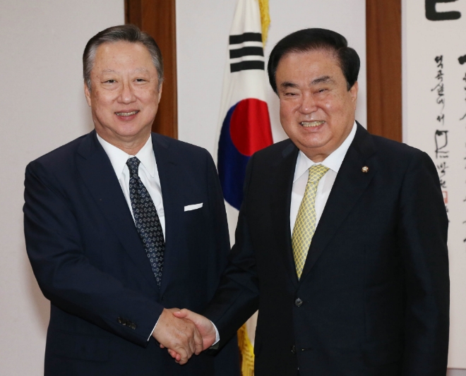 박 회장은 문 의장을 만난 자리에서 “8월 임시국회 끝나고 9월 정기국회 시작하기 직전인데다, 새로 의장단 구성과 각당 대표님들, 주요 소위의 위원장 등 다 새로 임명돼 지금 시점이 인사드리기 좋은 시점”이라고 운을 뗀 뒤 “주로 부탁드린 말씀이지만 우리 기업을 좀 도와달라”고 예방 목적을 설명했다.