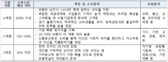 브라질 소비자는 사회계층을 기준으로 중산층에 해당하는 C계층(소득수준이 전체 평균 대비 100~150%)이 빠른 성장세를 보이고 있다. 이들은 비생필품에 대한 재량지출이 많아 각종 내구소비재와 교육, 관광 관련 상품이 주요 수혜분야로 꼽힌다.