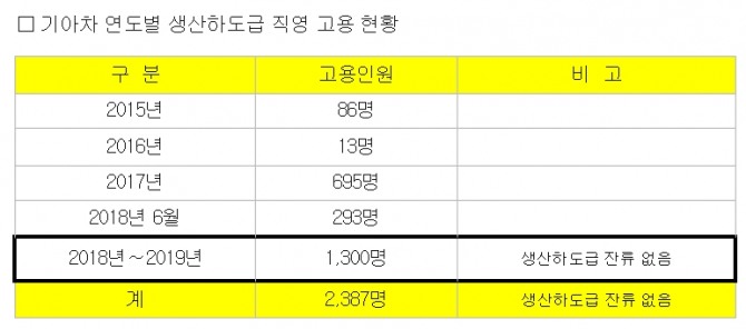 기아자동차는 2015년부터 지난 6월말까지 사내하도급 근로자 1087명을고용 완료했다. 이날 추가로 2019년까지 1300명을 고용하기로 합의해 사내하도급 문제에 대한 근본적인 해결이 이뤄질 것으로 기대된다.