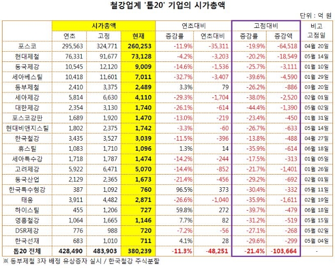 22일 관련 업계에 따르면 국내 철강업계 상위 20개 기업들의 시가총액을 조사한 결과, 19일 종가 기준으로 38조239억원으로 집계됐다. 올해 고점 대비 21.4% 급감했다. 금액으로는 10조3664억원이 날아갔다.