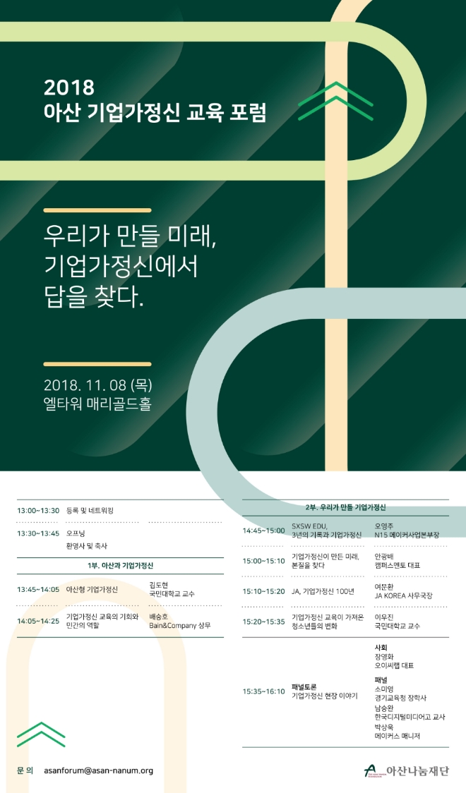 이미지 확대보기이날 포럼은 ‘우리가 만들 미래, 기업가정신에서 답을 찾다’를 주제로 진행된다. 아산나눔재단은 아산형 기업가정신과 기업가정신 교육의 필요성에 대해 설명하고, 현장에서 교육을 실시하는 이들과 생생한 이야기를 나눌 예정이다.