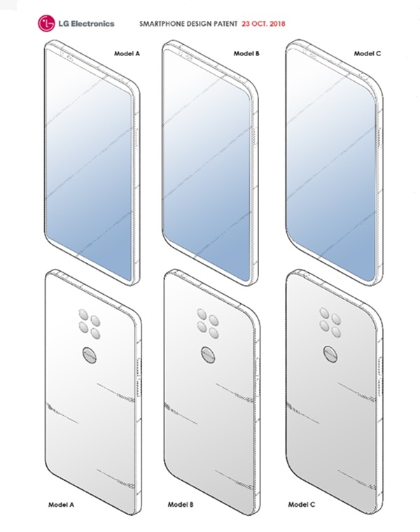 LG전자가 특허 속 모델A 도면을 보면 얇은 스크린 엣지를 볼 수 있다. 후면을 보면 지문센서가 보인다. 또한 3개의 카메라와 플래시가 정사각형으로 배치돼 있다. 이 배치는 마치 지난 16일 화웨이가 발표한 메이트20시리즈와 비슷하다.