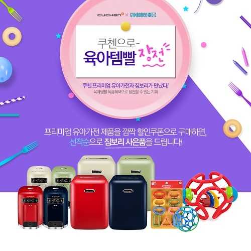 쿠첸과 짐보리가 함께 하는 이번 특별 기획전은 쿠첸 공식 통합사이트 쿠첸닷컴에서 진행된다. 쿠첸닷컴에서 깜짝 할인 쿠폰을 다운로드 후 프리미엄 유아 가전 ‘쿠첸 베이비케어’ 구입 시 적용하면 특별 할인 혜택과 함께 선착순으로 짐보리 교구를 받을 수 있다.