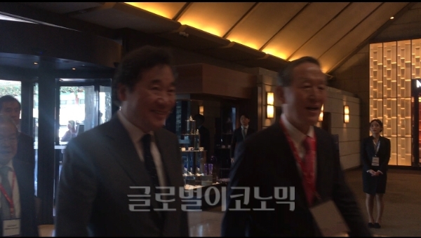 이낙연 국무총리(좌)와 허창수 GS그룹 회장(우)이 20일 서울 중구 신라호텔에서 열린 2018 보아오 포럼 서울회의에 참석하기 위해 담소를 나누며 함께 입장하고 있다.