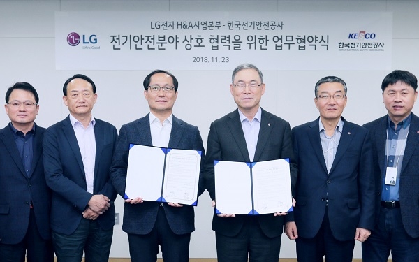 이미지 확대보기LG전자와 한국전기안전공사는 23일 경남 창원시 창원R&D센터에서 한국전기안전공사 조성완 사장, LG전자 H&A사업본부장 송대현 사장 등이 참석한 가운데 ‘전기안전분야 상호 협력을 위한 업무협약’을 체결했다고 25일 밝혔다.