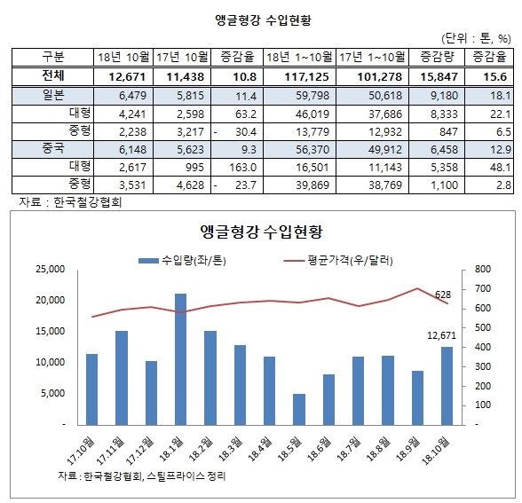 앵글형강 제품 중 대형 사이즈의 수입량이 급증했다. 일본산 대형앵글은 전년 대비 22.1%, 중국산 대형앵글은 전년 대비 48.1% 급증했다.
