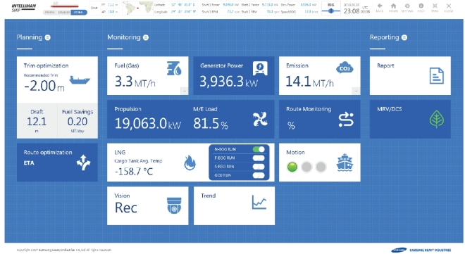 이미지 확대보기삼성중공업의 스마트십 솔루션인 'INTELLIMAN Ship'(인텔리만 십)에 적용된 이 기술은 시스템에서 자동으로 △출발 및 도착 항구의 위치정보와 시간을 기록하고 △운항 상태에 따른 연료 사용량과 이산화탄소 배출량을 실시간으로 계측해 모니터링 할 수 있으며 △축적된 데이터를 활용해 정확한 운항 리포트를 생성했다.