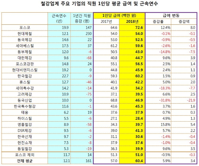단, 현대제철은 올해 신규고용을 업계 최다수로 늘리면서 급여가 비교적 낮게 나온 것으로 평가된다. 3분기 말 기준 직원은 1만1511명으로 1년 새 230명이나 늘어났다. 한국철강은 근속연수가 업계 최장인 22.7년에 달한다는 점이 반영된 것으로 풀이된다.