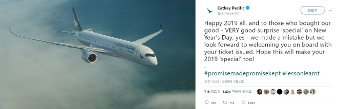 이에 캐세이패시픽은 초특가 할인에 대한 예약을 취소하지 않고 할인 가격의 판매 예약을 그대로 받아들이겠다고 밝혔다. 실수를 저질렀지만 고객과의 약속을 위해 손실을 감수하는 쪽을 선택한 것이다.