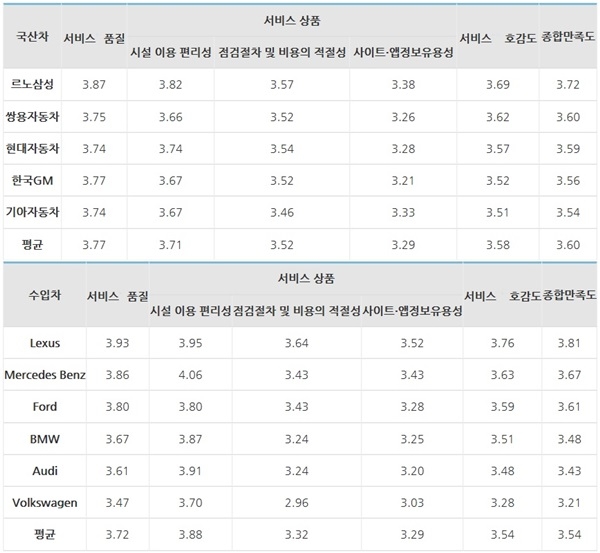 업체별로는 국산차의 경우 르노삼성이 3.87점으로 가장 높았고 이어 ▲한국GM 3.77점 ▲쌍용자동차 3.75점 ▲현대자동차 3.74점 ▲기아자동차 3.74점 등 순이었다. 수입차 업체별로는 렉서스가 3.93점으로 가장 높았고 그 뒤를 ▲벤츠 3.86점 ▲포드 3.80점 ▲BMW 3.67점 ▲아우디 3.61점 ▲폭스바겐 3.47점 등 순으로 따랐다.
